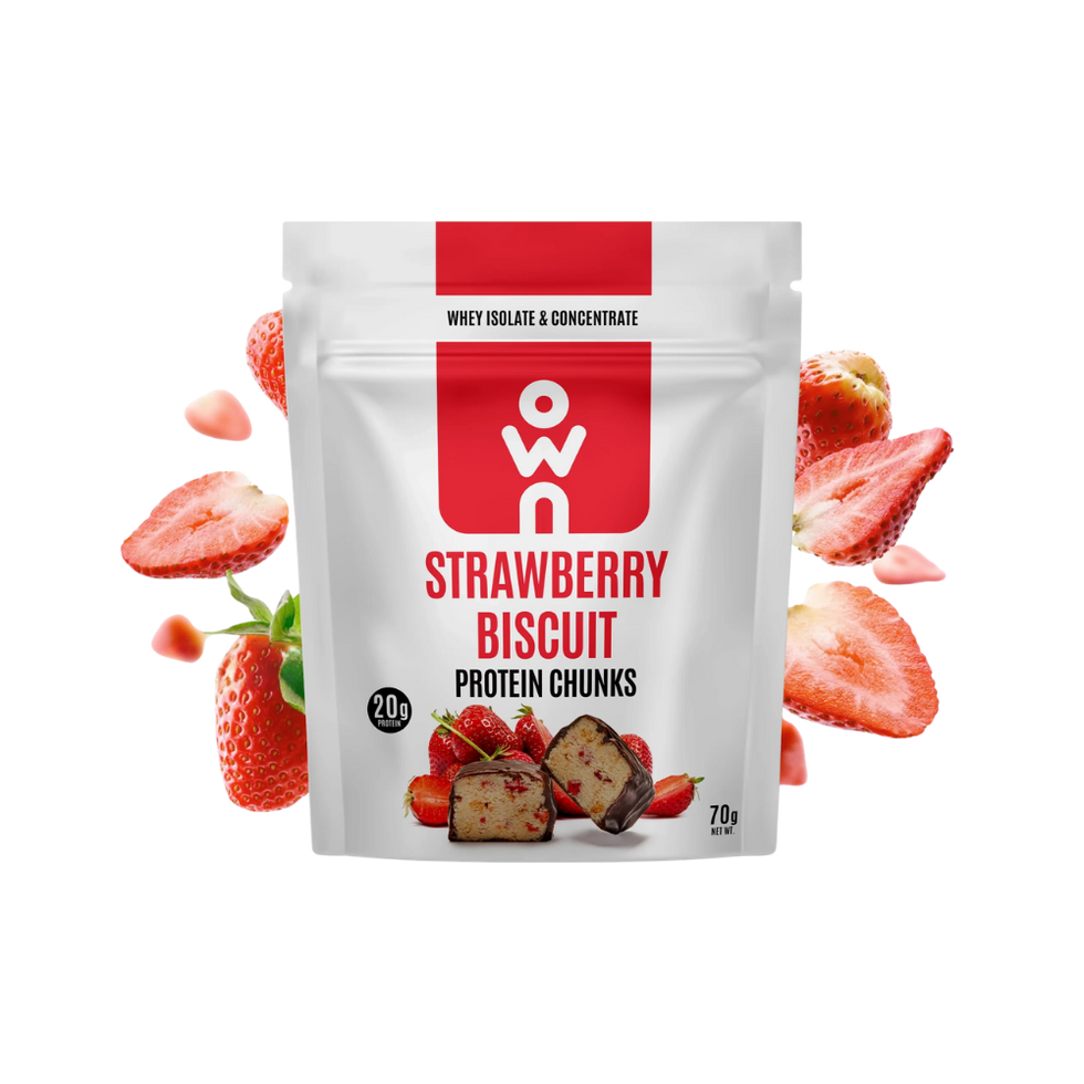 - OWN 20g of Whey Isolate & Concentrate Protein blended with real dried strawberry pieces. .